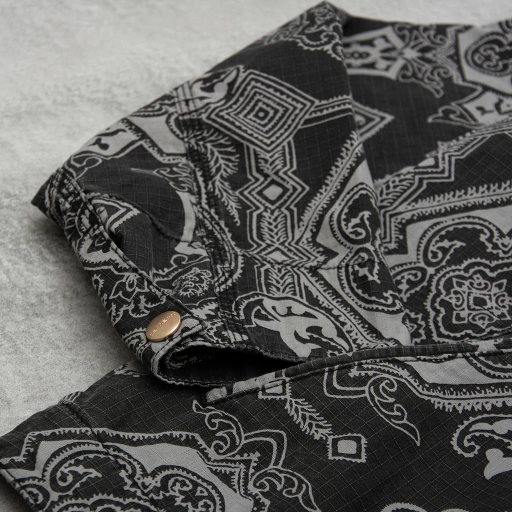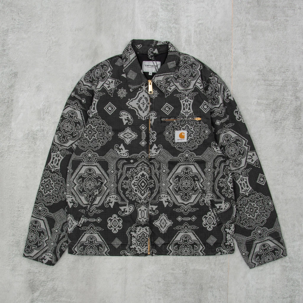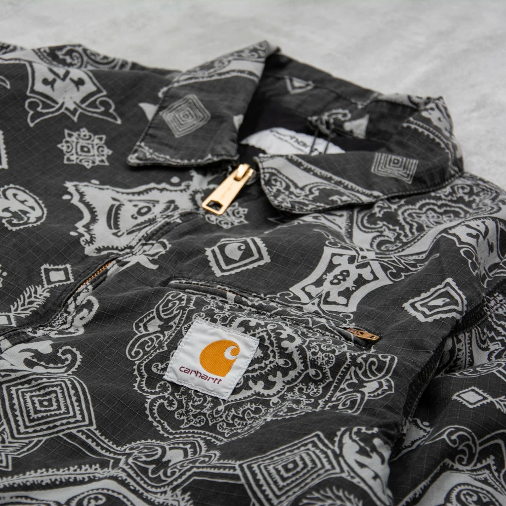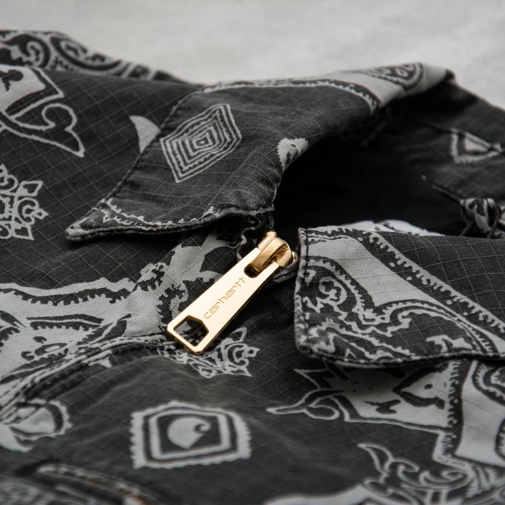 Carhartt Detroit Verse Jacket –Â Â constructed in a lightweight 6.5 oz Columbia ripstop fabric, and features an allover baroque-inspired Verse print. The jacket is cut to a loose, boxy fit, and has been heavily stone-washed, resulting in a used and worn-in appearance. A gold-tone zip fly at the front and on the chest pocket offers tactile detailing.